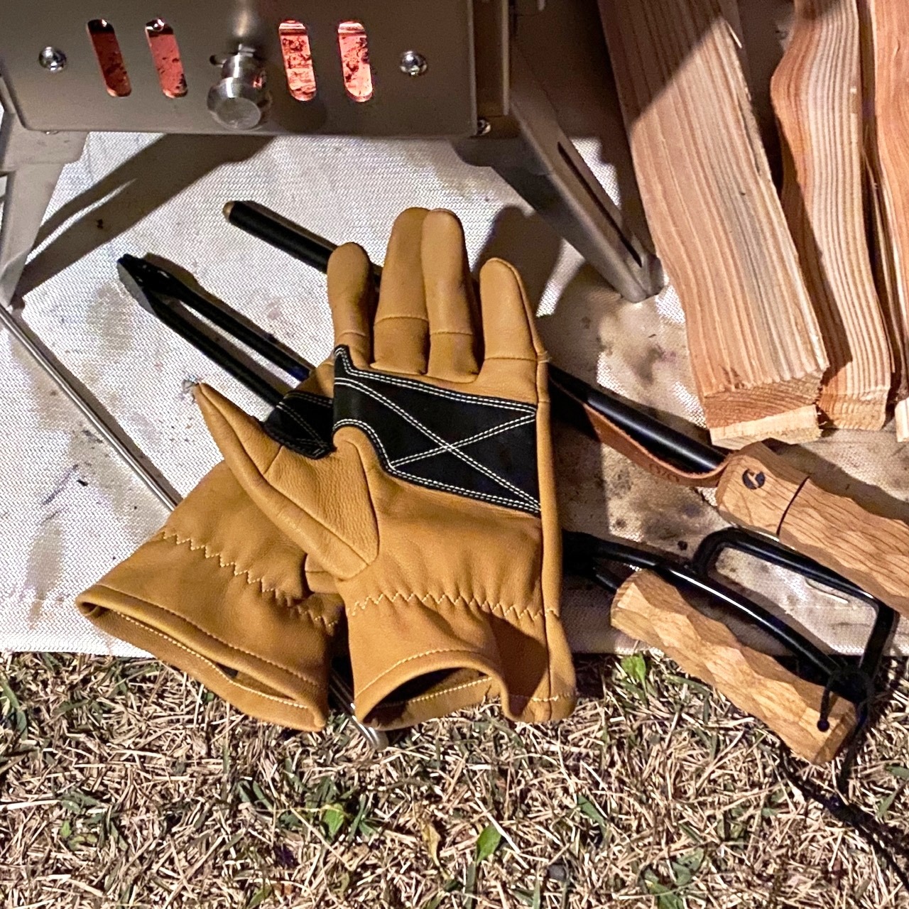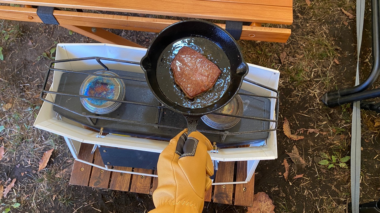 耐熱加工はされていませんが、焚き火作業や熱されたダッチオーブンやスキレットなどの調理器具を持ち運んだりすることは、他のキャンプグローブと同じようにこなせます。