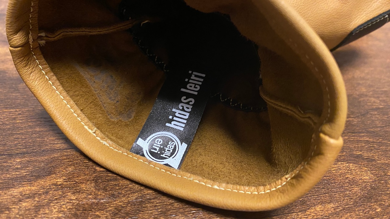 ③オリジナルのタグを内側に配置しました。「あっちゃのうちキャン」ではなく、ネットショップ名の「hidas leiri」のロゴをグローブの内側に。
