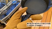 ②人差し指に当て革を追加することで、熱したスキレットを持てる時間が圧倒的に長くなっています。(オリジナルでは10秒でしたが47秒持ち続けることができました※スキレットの温度などの環境、熱の感じ方などによって差はあると思います。耐熱加工はされていません)